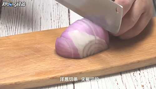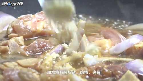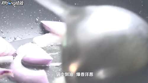锅中倒油爆香洋葱,放入鸡腿、生抽翻炒。