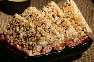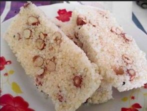 然后再用糖精、白糖和饴糖制成糖浆,将制好的米倒入糖浆内,加上少许的花生仁,在锅内拌匀后,倒于案上匣内,捏成方块,再用刀切成小块,即成产品。米花糖每块重为125克。