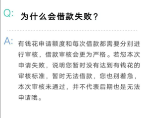 失败有很多原因,但必须明白的是有钱花的贷款额度是有钱花系统通过人工智能及大数据风控技术对借款人的个人信用、资质等方面进行综合评估确定的,所以人工无法干预。