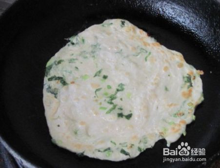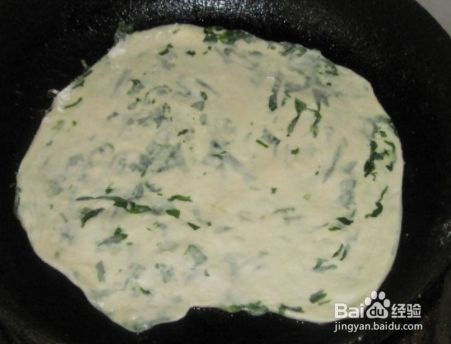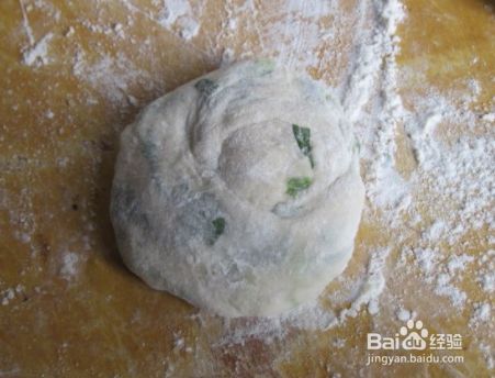 擀成圆形,锅底放油,烧热,转小火,放入擀好的饼。