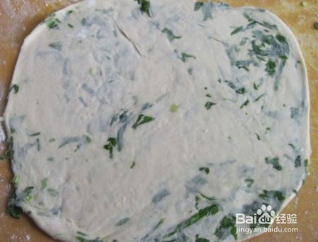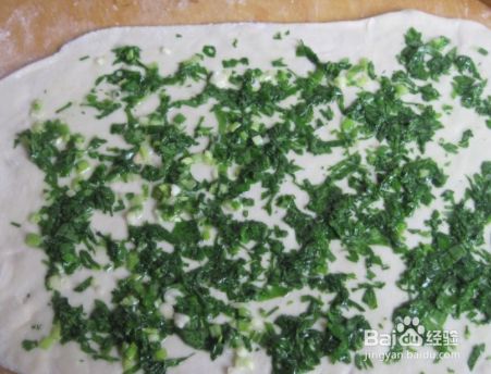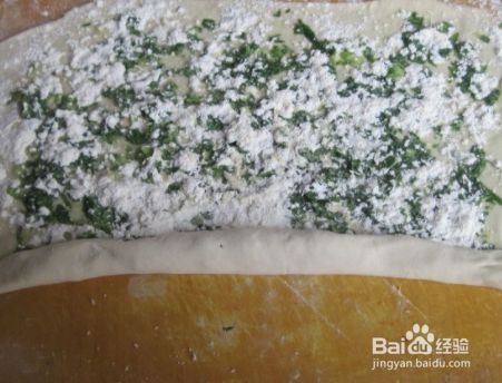 放入腌制好的芹菜叶,铺均匀,撒点干面粉,容易起层。