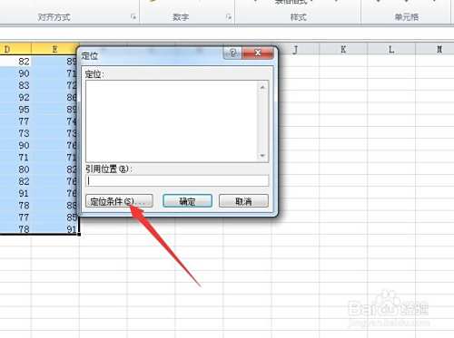 选中数据列之后,点击电脑键盘上的【Ctrl】+【G】,调出定位设置的界面,点击界面上的【定位条件】