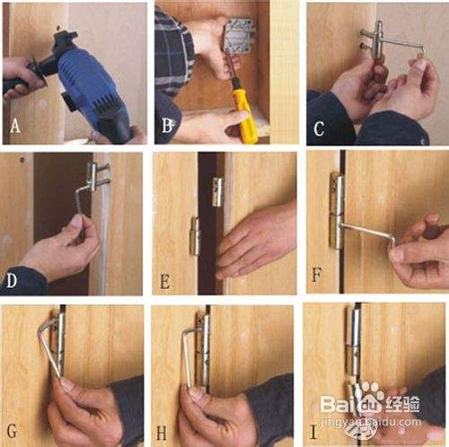 按照图中步骤先用铅笔确认合页的安装位置,如图A打孔。然后如图C把一门板与门框上的合页安装好,