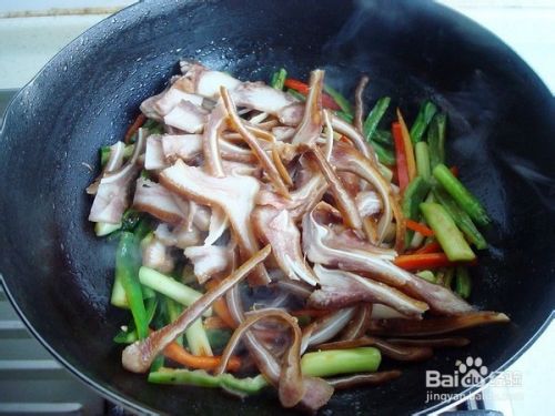 加生抽翻炒到猪耳朵和蒜苗都出香味以后,如果有蒜苗叶子可以加了