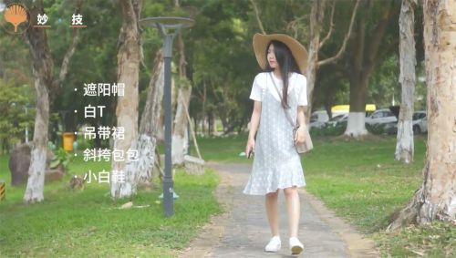 1邻家小女生套装,准备服饰:遮阳帽,白色T恤,吊带裙,斜挎包,小白鞋。