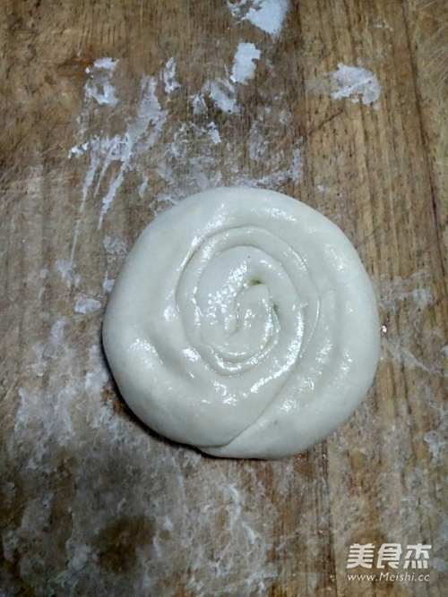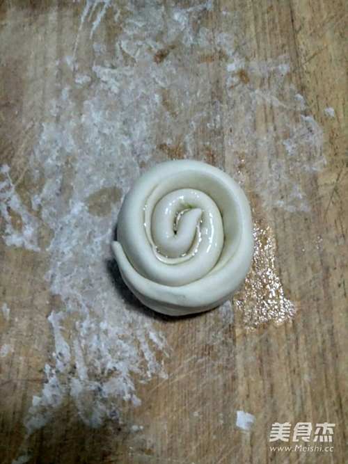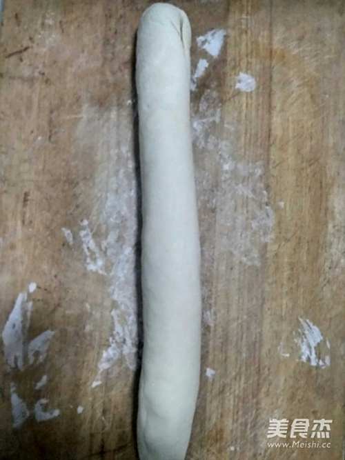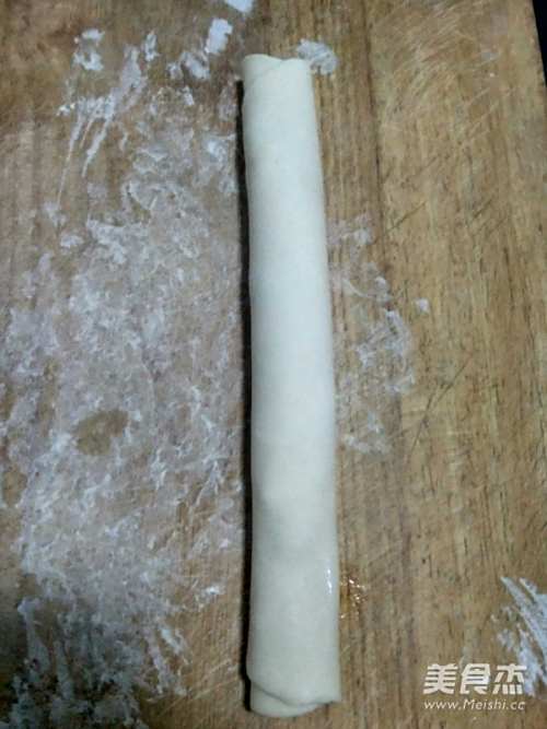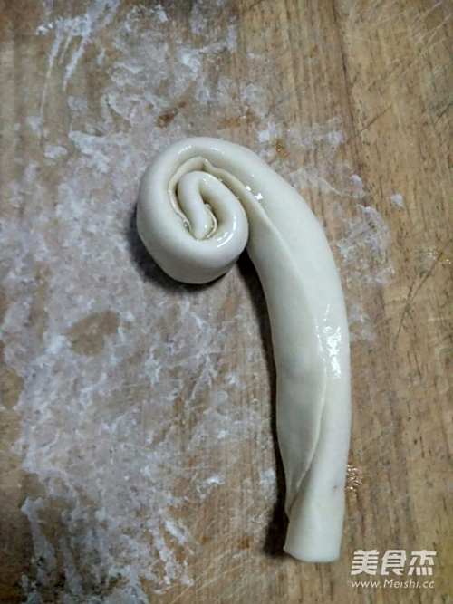 11卷好的长条面团从一边卷向另一边,卷成盘头卷的样子。