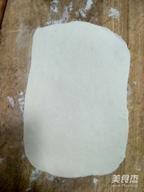 7取一个面剂子,擀成长方形(有人说不会擀长方形,可以自中间分别向四个角的方向擀2下,然后再横竖擀2下,找个平衡,自己控制好擀面杖的力度和面皮的薄厚)