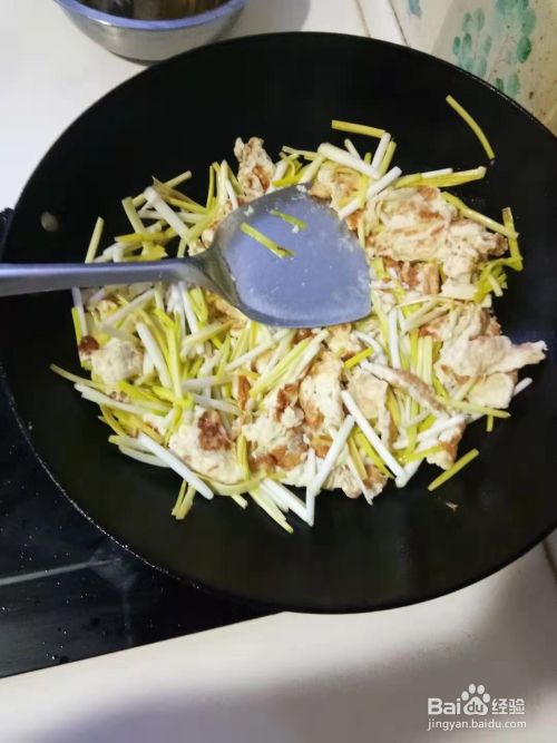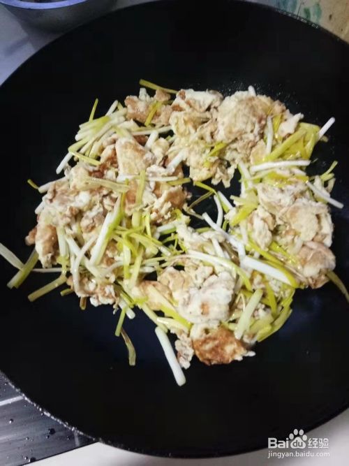 然后放入蒜苗,翻炒几下,将鸡蛋和蒜苗均匀混合。