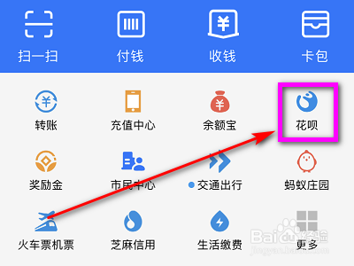 1.打开之后的支付宝的页面中,找到“花呗”,然后点击。