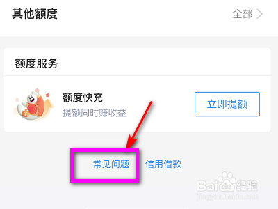 在我们进去花呗,然后我们在花呗里面在点击我们的额度,下一步我们在这个花呗的额度的界面,然后我们只需要再点击“常见问题”。