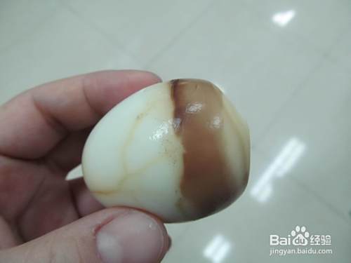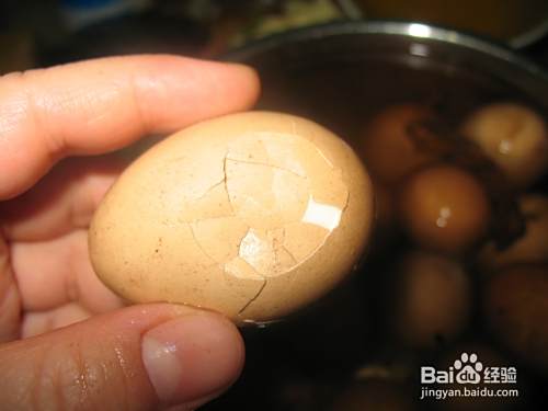 将鸡蛋拿出轻轻将表皮敲裂,但不要全碎了,敲至有裂纹即可。