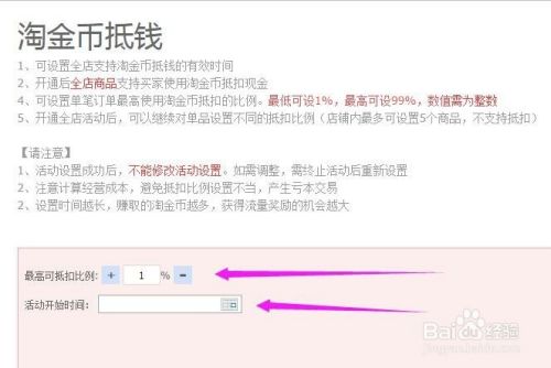 在“最高可抵扣比例”这里填写淘金币抵扣货款的百分比;