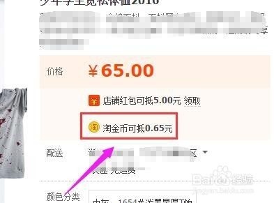 打开商品详情页面,在页面上商品价格的下方位置就会展示出淘金币可抵多少钱。如下图: