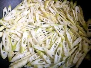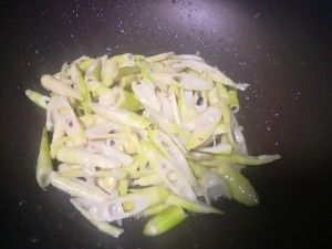 锅洗净擦干,锅中无油中小火下笋,干煸烫笋,翻炒几次,笋转绿出清香,均匀的撒些水,盖锅大火焖几分钟(除笋的麻涩),笋出锅。