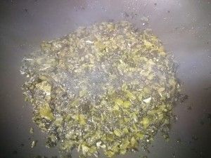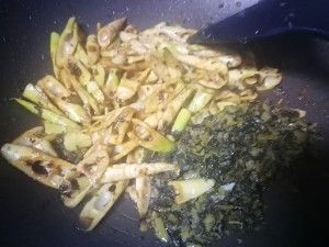 腌菜洗净,切碎口感更好更入味,中火,锅中剩的油炒腌菜,油不够可加些,腌菜翻炒出香拨到锅旁边(半边随便左右)。