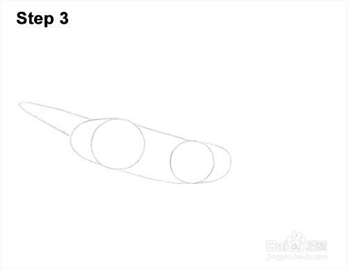 步骤2:在左侧圆圈左侧画一条弧线,作为身体指南的第二部分。由此产生的弧形和圆形组合看起来应该与鸡蛋相似。现在在右侧的圆圈右侧绘制另一个类似的弧线。由此产生的形状也应该类似于一个鸡蛋,但指向相反的方向。画出连接两个鸡蛋形状的两条线,以完成对mosasaurus身体的指导。