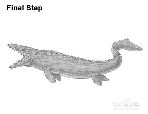 最后一步(可选):在你的mosasaurus绘图中添加一些阴影以获得额外的细节。全身使用中等价值。无论哪里都有细节线条,比如眼睛周围,请使用较暗的值。在额头上方和身体上方使用稍微较轻的值来创建高光。来自侏罗纪世界的mosasaurus是灰色的,但没有人真正知道它们的样子,所以你可以任何你想要的方式遮蔽你的!不要担心太阴影。粗略的值给皮肤一个砂砾质地。
