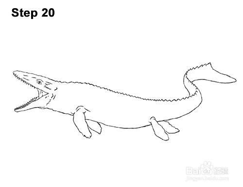 第18步:继续从身体顶部向mosasaurus的尾部绘制三角形尖刺。当你到达中间部分时,用尖刺切割尾部,而不是沿着指南的顶部路径。继续在指南的右边缘添加尖刺,然后再次将尾巴切到左边。当你再次到达尾部的左边缘时,继续在那里添加尖峰。以这种方式画出尖峰有助于强调恐龙尾巴的平坦性。使尾部附近的尖峰更大一些。