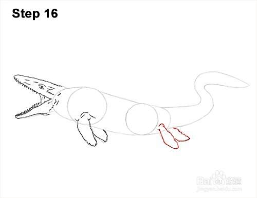 第16步:使用右侧的U形线作为指导,绘制mosasaurus的后鳍。按照指南的路径,但使顶部更薄,并在皮肤底部添加一些曲线。使最后一个U形线变暗以创建另一个后鳍。