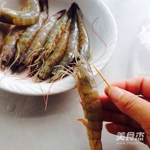 2用牙签从虾的肩部,挑起虾肠去掉。