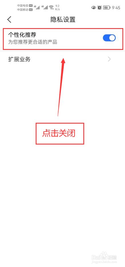 点击关闭个性化推荐功能开关(图片中圈红的部分)