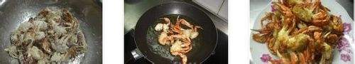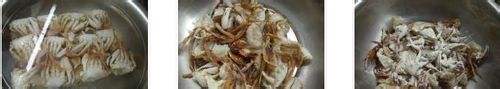 下炸好的切蟹煸炒,接着放黄酒,生抽,白糖翻炒。