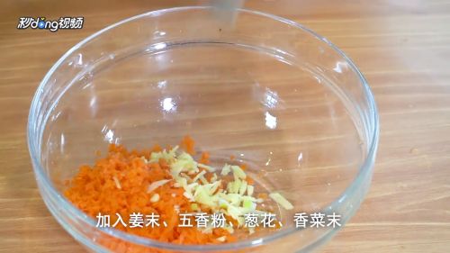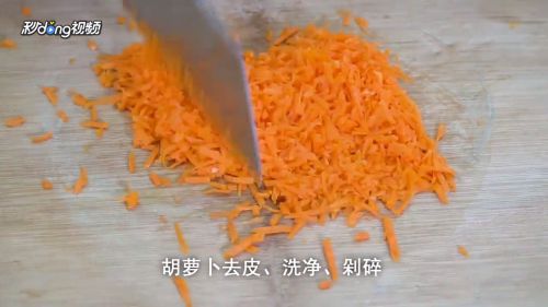 2胡萝卜剁碎:胡萝卜去皮、洗净、剁碎,葱切碎,姜切末,香菜切碎备用。