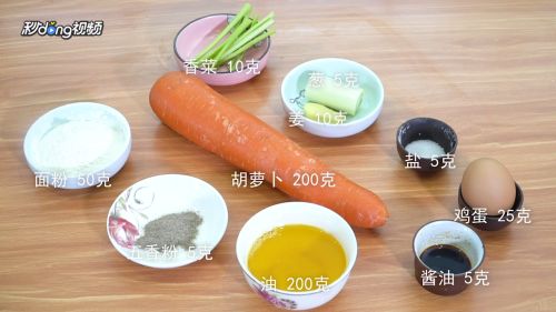 1食材展示:胡萝卜200克、油200克、姜10克、五香粉5克、香菜10克、酱油5克、盐5克、鸡蛋25克、面粉50克。