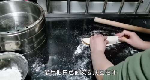 15依次将彩色面团放入白色面皮当中,最后把白色面皮卷成圆柱体。