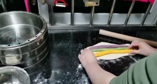 14将紫薯面团、菠菜面团、南瓜面团分别揉成圆柱。