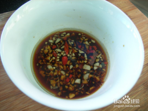 将大蒜、小米椒、葱切成碎末,与生抽、辣椒油、芝麻油、盐一起搅拌均匀做成蘸料,使焖子味道更佳。