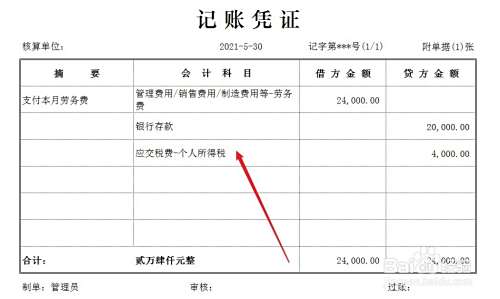 企业支付个人劳务费时,需同时计提代扣代缴的个税,会计分录如下。