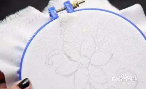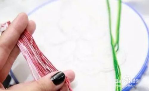把画好图纸的布料用绣花绷固定好,最好是绷紧点。一般我们把线剪一段下来使用,线的长短取决于你准备绣花的区域大小,一般我们不要把线留的太长了,容易打结,拉线也很麻烦。现在我们通过针眼把线穿过去,一边留出一个小尾巴就可以了。