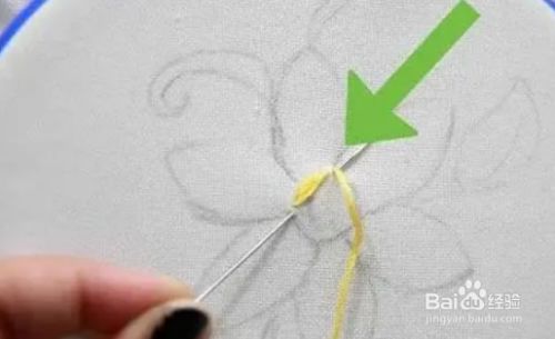 我们从布料的背面入针,然后根据我们画的图纸来走针线。我们把长线末端打一个小结,防止脱线。我们开始刺绣了,刚开始我们根据图案所标的一个区域一个区域的刺绣,这样不容易出错。