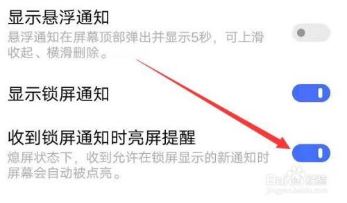 在“通知与状态栏”管理页面中,激活“显示锁屏通知”的子选项【收到锁屏通知时亮屏提醒】完成。