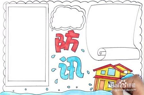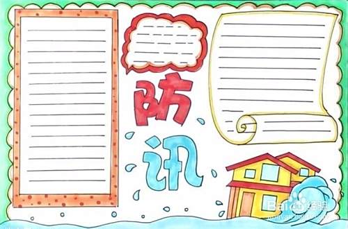 先在中间画成报头文字,底部画上水平面,右下角画出洪水中的房子和浪花,再画上背景边框,然后在空白处画上三个形状各异的小边框,接下来给画面涂上好看的颜色,最后在边框里画上文字栏,简单的手抄报就画好了。