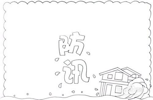 先在中间画成报头文字,底部画上水平面,右下角画出洪水中的房子和浪花,注意画一些溅起的水滴,并画上花边形状的背景边框。
