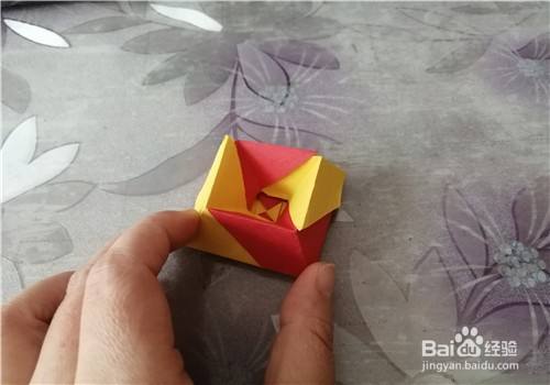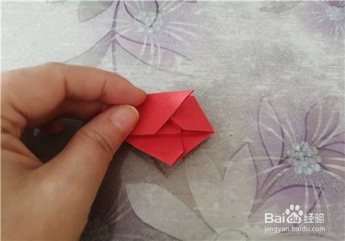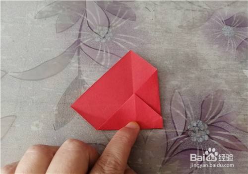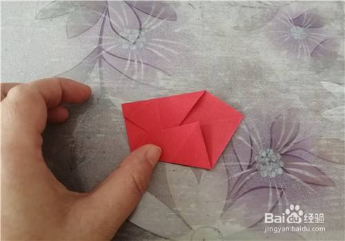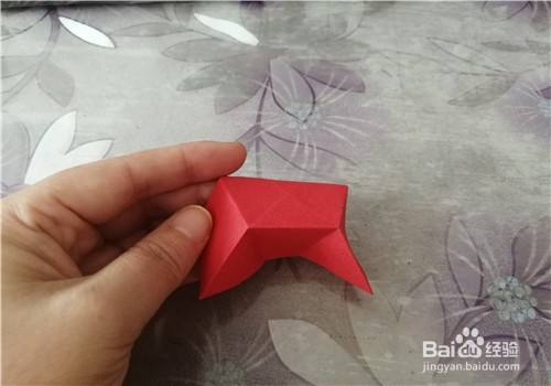 再把彩纸向左转,把下侧的边向上折,如图一。然后把上面的部分向下折,如图二。接下来打开彩纸,按照折痕把两侧的角捏出来,如图三。