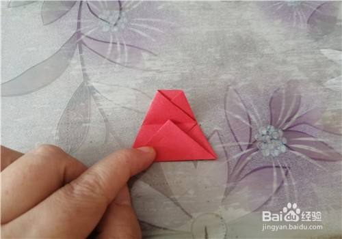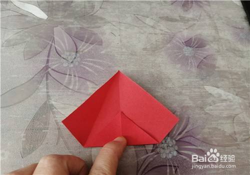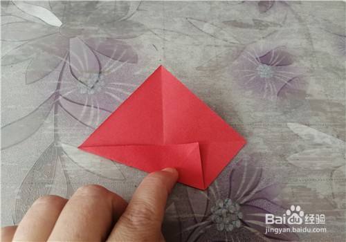 按照折痕把彩纸折成图一的样子,把左下侧的边向外拉,并把折痕捏一下,如图二。折好后就是图三的样子。