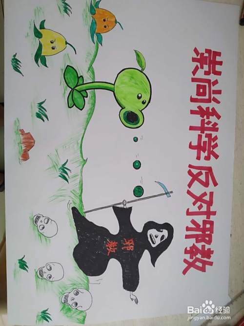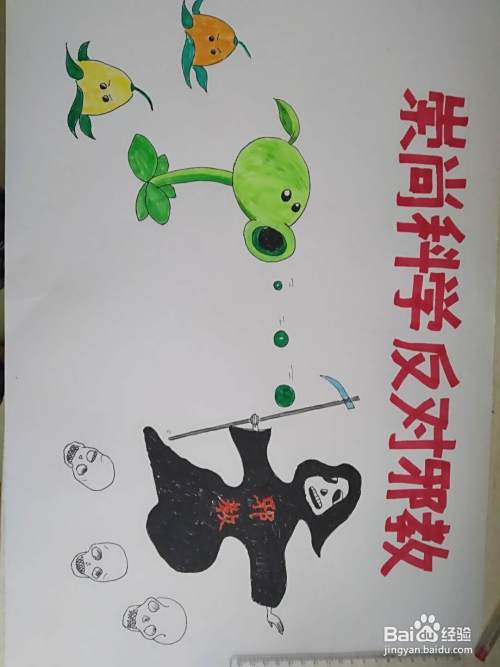第四步将豌豆射手涂色,写上主题语崇山科学反对邪教。