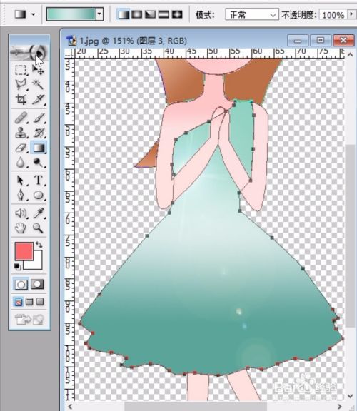 设置一个青色的渐变,我们填充佛系女孩的长裙,这个长裙图层在最下方,不要覆盖女孩的手臂。给长裙图层做一个灯光滤镜。
