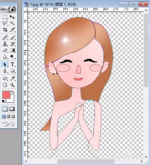 设置前景色为黑色,我们填充佛系女孩的眉毛。选择佛系女孩的鼻子路径,我们用曲线工具调整一下明亮度,让其稍微暗一些,设置一个粉红的前景色,我们填充佛系女孩的嘴唇。