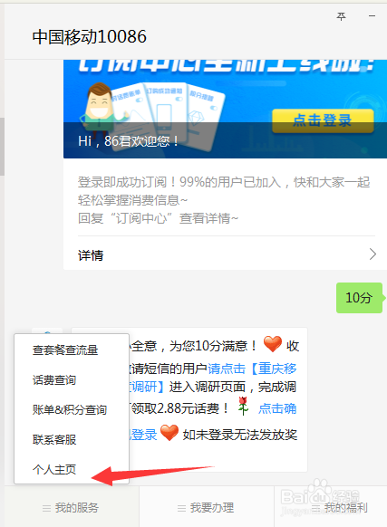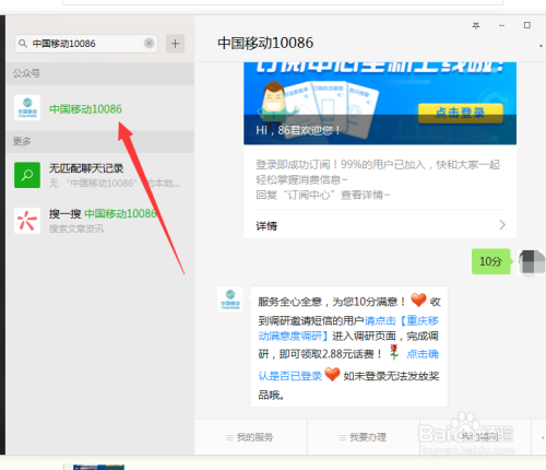 用户首先需要使用微信在里面进行搜索中国移动10086等字样进入到移动界面。