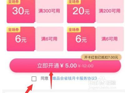 2、勾选兼糟“同意《唯品会省钱月卡服务协议》”泉王,点击“立即开通”。