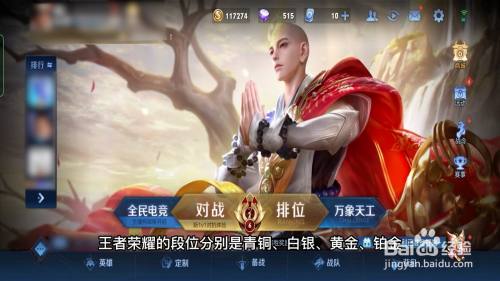 王者荣耀一共有七个段位,分别是青铜、白银、黄金、铂金、钻石、星耀、王者,具体操作如下: