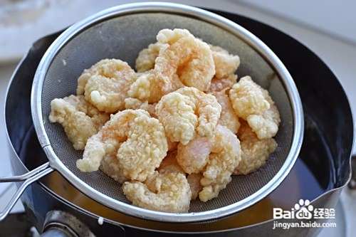 炸至虾仁表面定型变色,捞出控油。再次升高油温,将炸好的虾仁入锅复炸三十秒左右