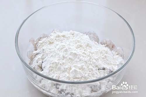 在虾仁中调入料酒和盐,戴一次性手套抓拌均匀,腌制十分钟。打入一个鸡蛋,再放入玉米淀粉和中筋面粉。继续轻轻抓拌,使虾仁均匀的挂上一层粘稠的薄浆。
