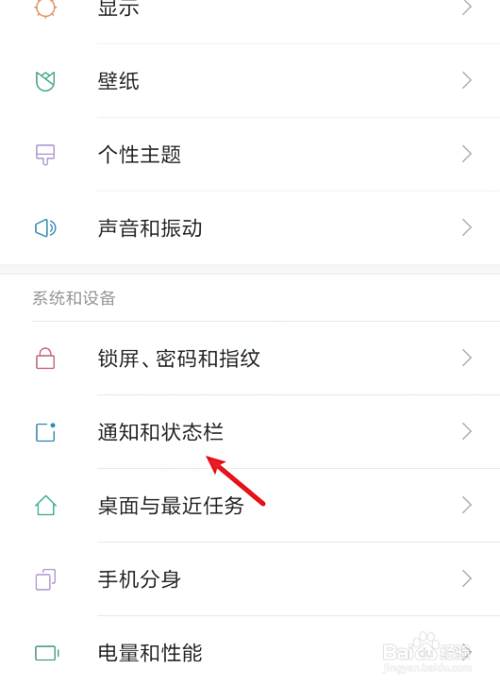在设置内,向上滑动,点击通知和状态栏的选项。