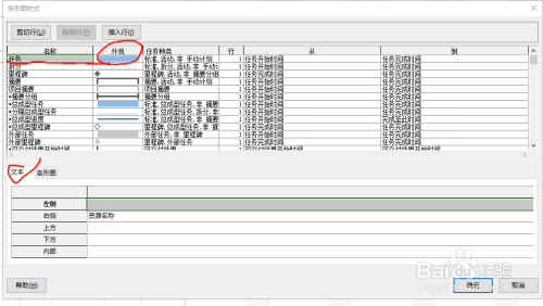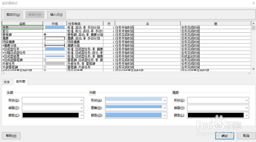 在“名称”栏选择要进行编辑的项,如“任务”,在下部“条形图”中可以对其外观进行编辑,在下部“文本”中可以添加文字内容。