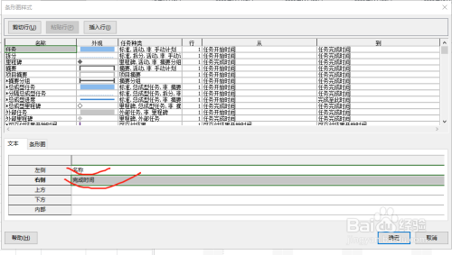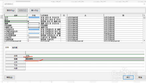 选择了相关名称如“任务”,点击文本,然后可以对横道图的左侧,右侧,上侧,下侧信息进行编辑,一般只对左侧、右侧信息进行编辑,如左侧编辑为“名称”,右侧编辑为“完成”